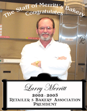 October 2002 - Larry Merritt becomes the 2003 President of The Retail Bakery Association. This honor is the culmination of over ten years of RBA involvement and service. RBA was originally organized in 1918, and represents retail bakers from all fifty states as well as Puerto Rico. RBA exists to assist small retail bakeries in growing their business through combined knowledge while keeping larger bakeries fresh and innovating with new ideas. Having benefited incalculably from years of RBA & GSWRBA membership, Larry believes in passing on his hard won knowledge to new bakers just starting out. He is the first person in Oklahoma to ever be President of RBA.