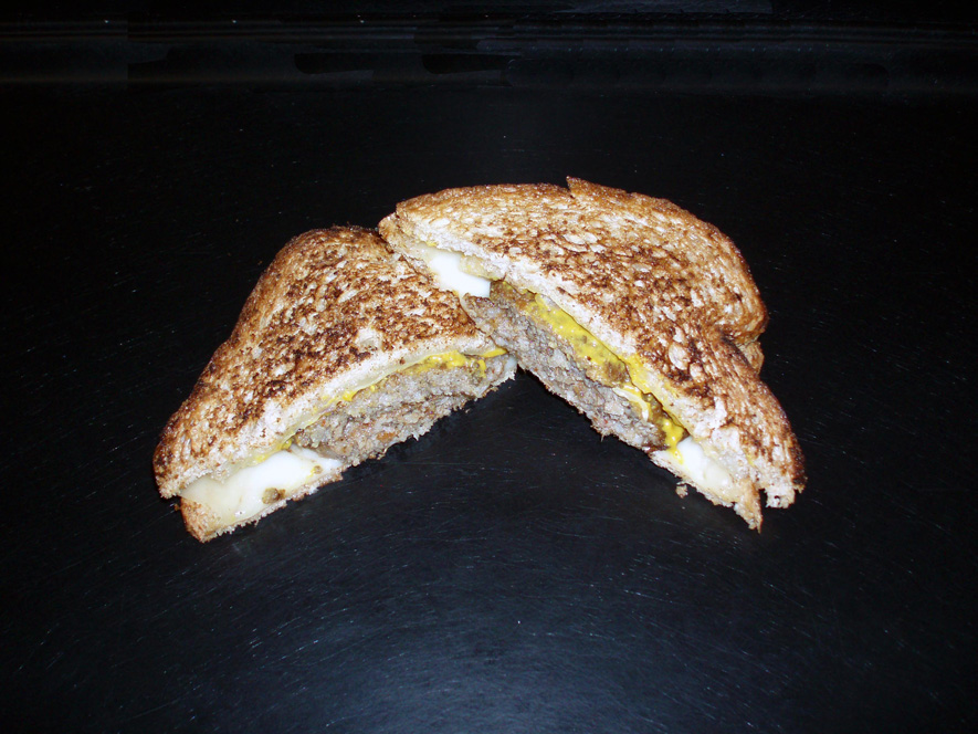 It's called a breakfast melt for a reason! We melt swiss cheese over two sausage patties, grilled onions and mustard on buttered grilled wheat bread.