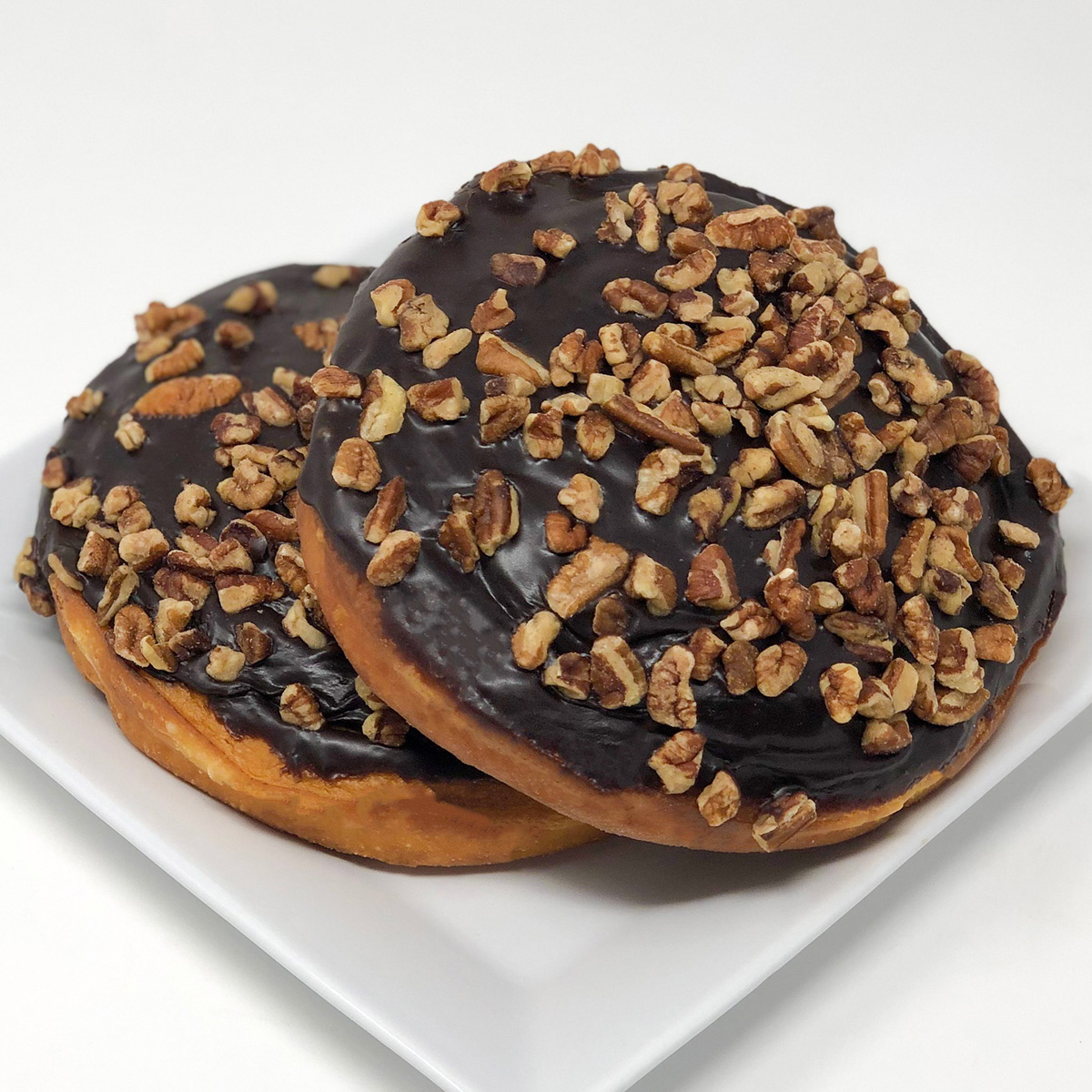 A fried cinnamon roll smothered in chocolate and pecans!