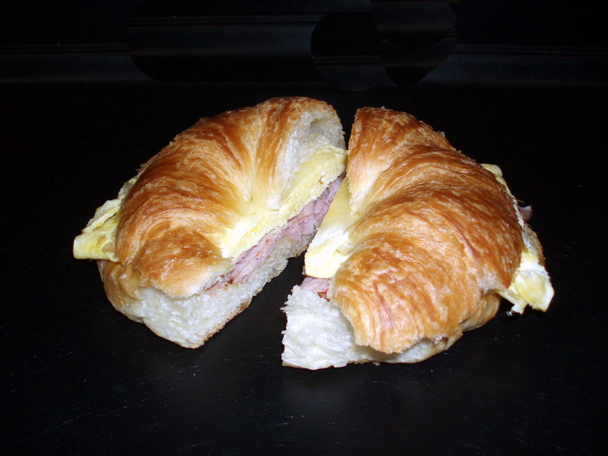 If you love our buttery croissant and scrambled eggs, you have got to try this sandwich! Scrambled eggs, grilled ham and swiss cheese inside a our fresh flaky croissant!