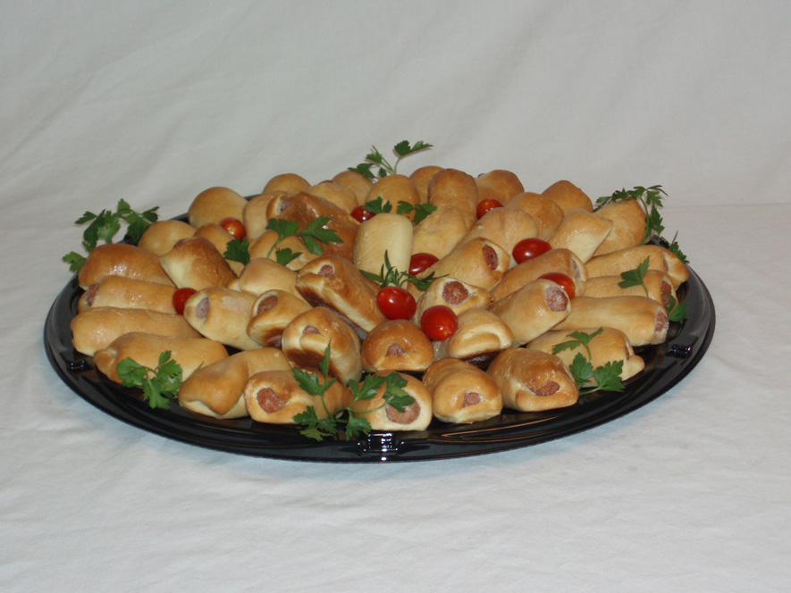 Our scrumptious 2 oz. sausage rolls garnished with parsley and cherry tomatoes. Serve these warm with mustard and you're ready to go! (48 sausage rolls)