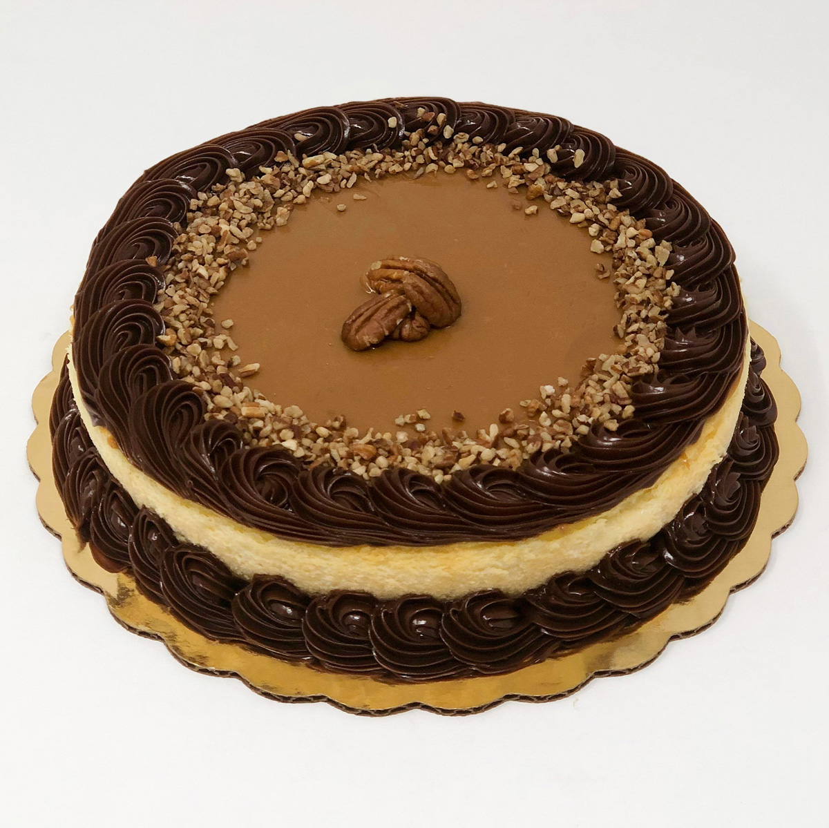 Our decadent New York cheesecake topped with rich dulce de leche caramel and fudgy chocolate ganache with just a touch of pecans!