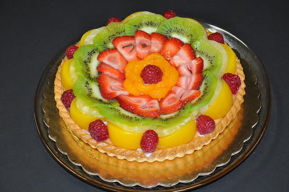 Enjoy our larger, shareable version of our classic fruit tart with friends or by yourself (we won't tell)! For this larger tart we fill a 9" tart shell with Italian pastry cream topped with a thin layer of cake and cover the whole top with seasonal fruit*.