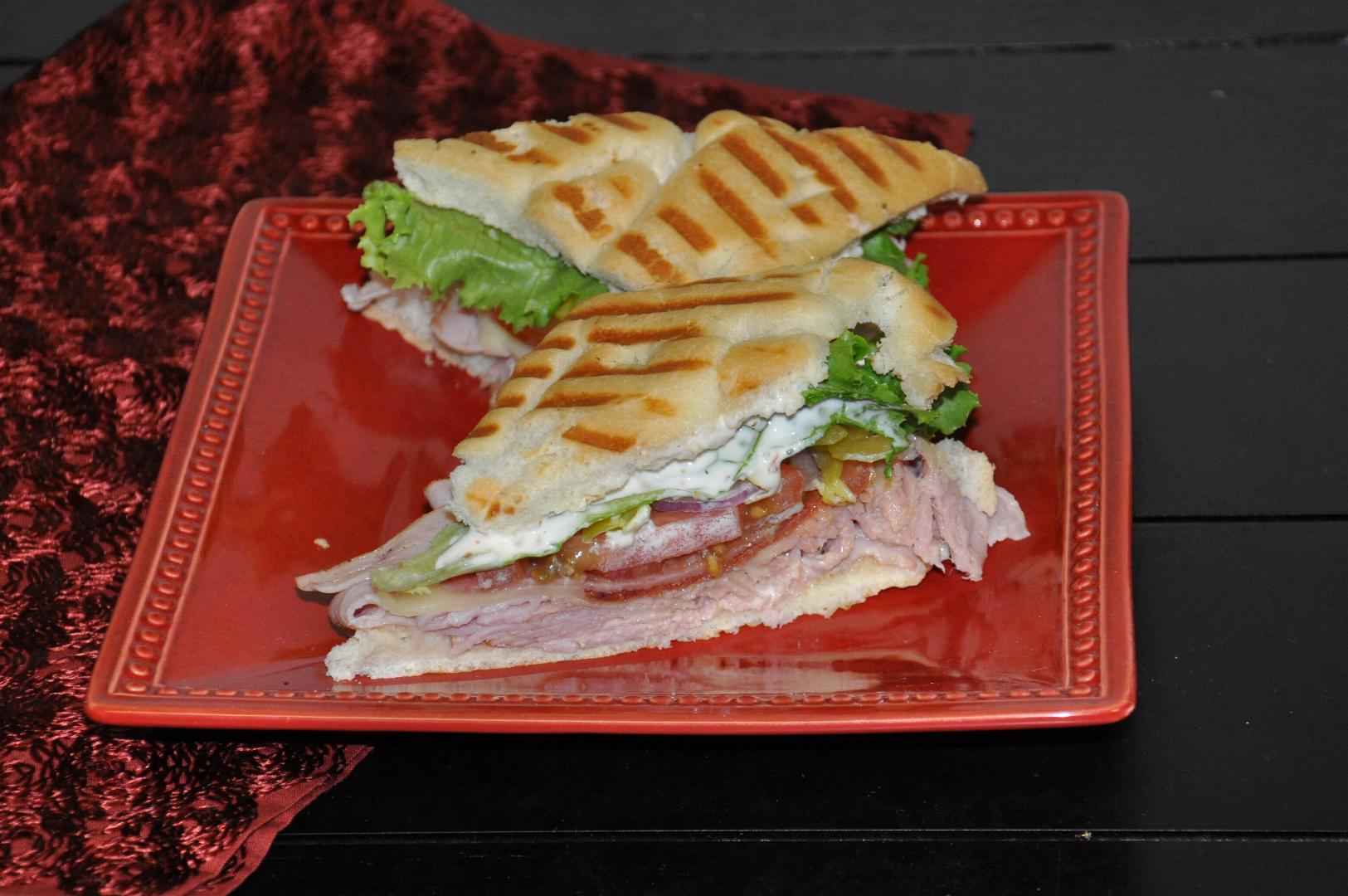 Ham, salami, pepperoni and swiss cheese, tomato, lettuce, red onion and pepperoncini on focaccia bread. If you're a meat lover, you need to try this!