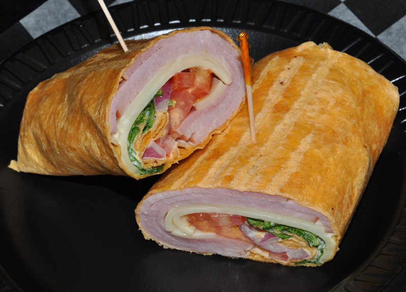 Ham and american cheese with lettuce, tomato and red onion with ranch dressing in a tortilla wrap. Choose from white, tomato, or spinach tortilla.