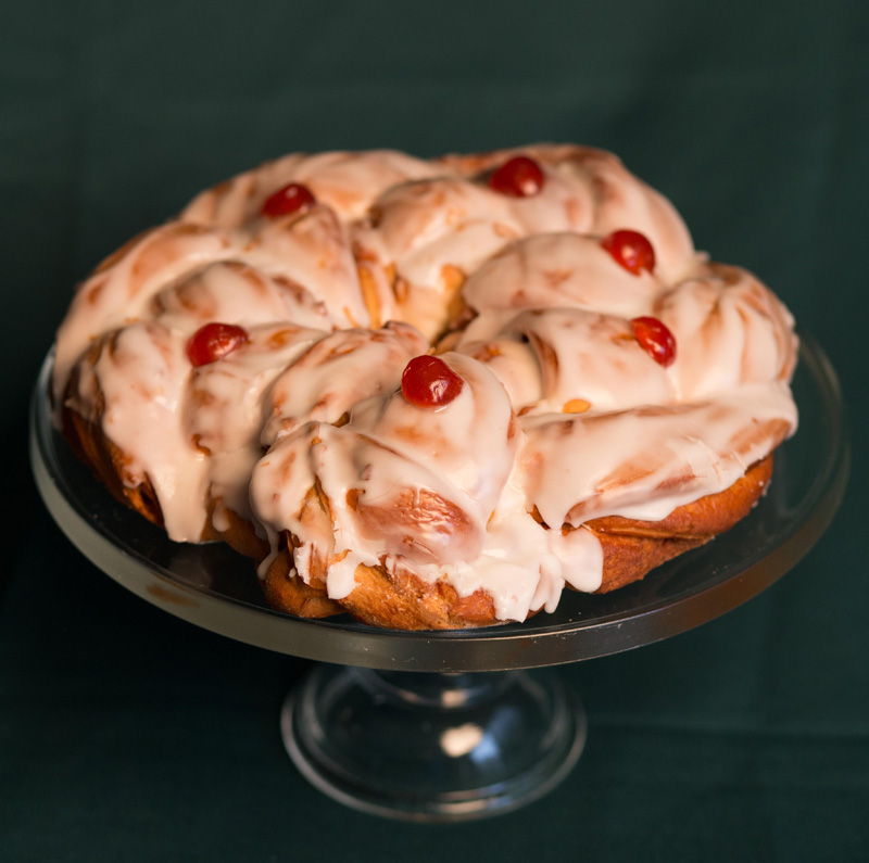 A braided cinnamon bread in the shape of a wreath decorated with cherries. It comes on a 12" black tray.