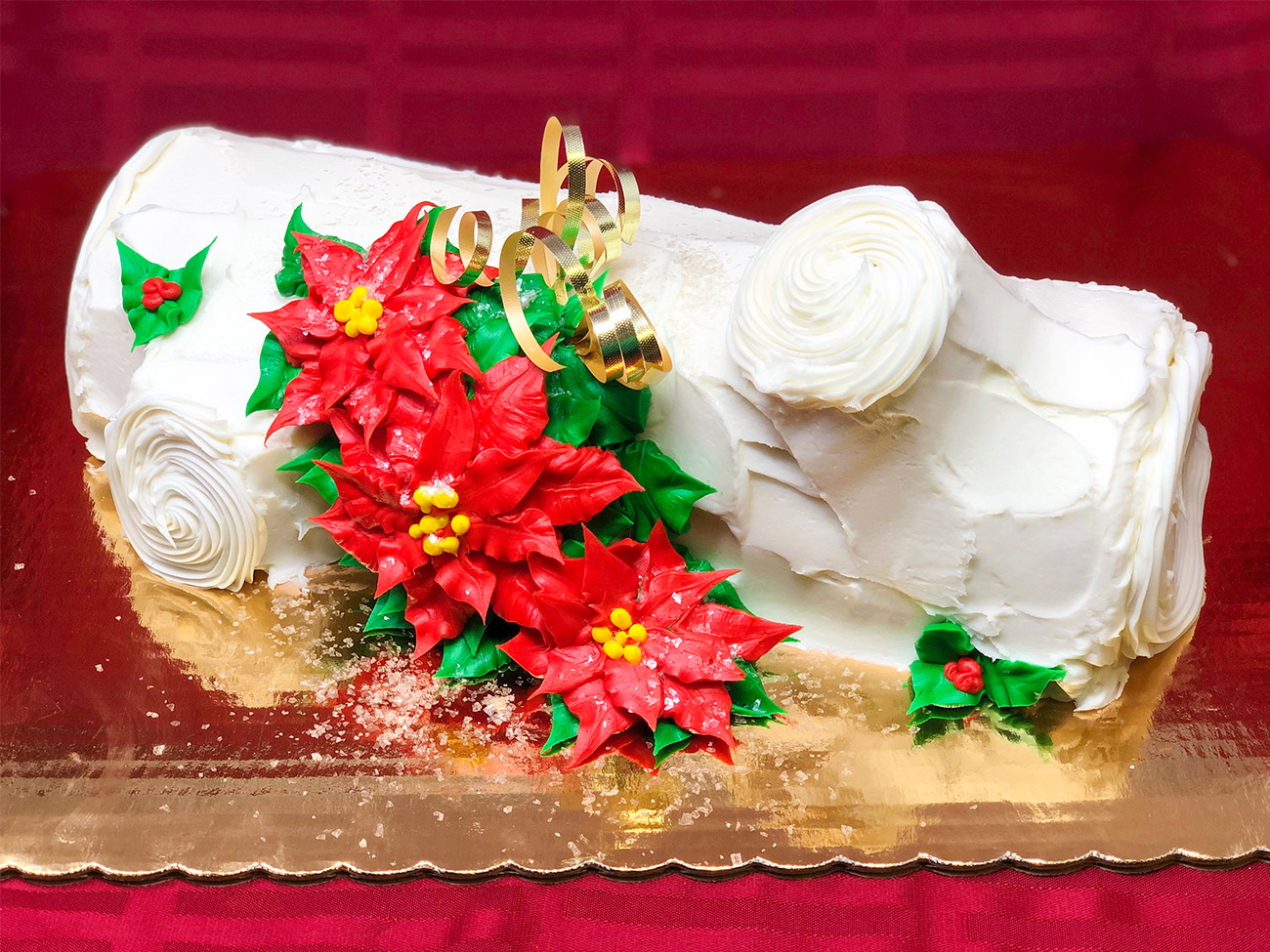 A French holiday favorite: a white cake with raspberry filling jelly roll decorated as a Yule Log