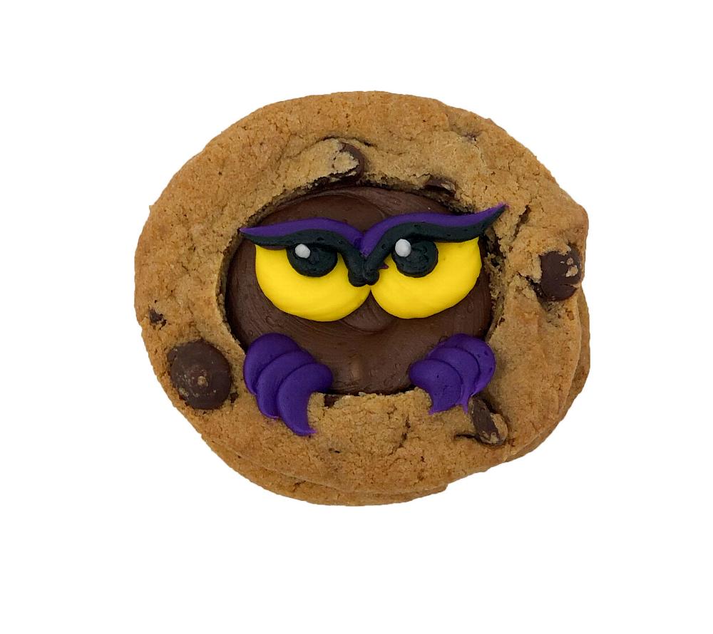 Two chocolate chip cookies decorated and sandwiched together to make a Halloween monster!