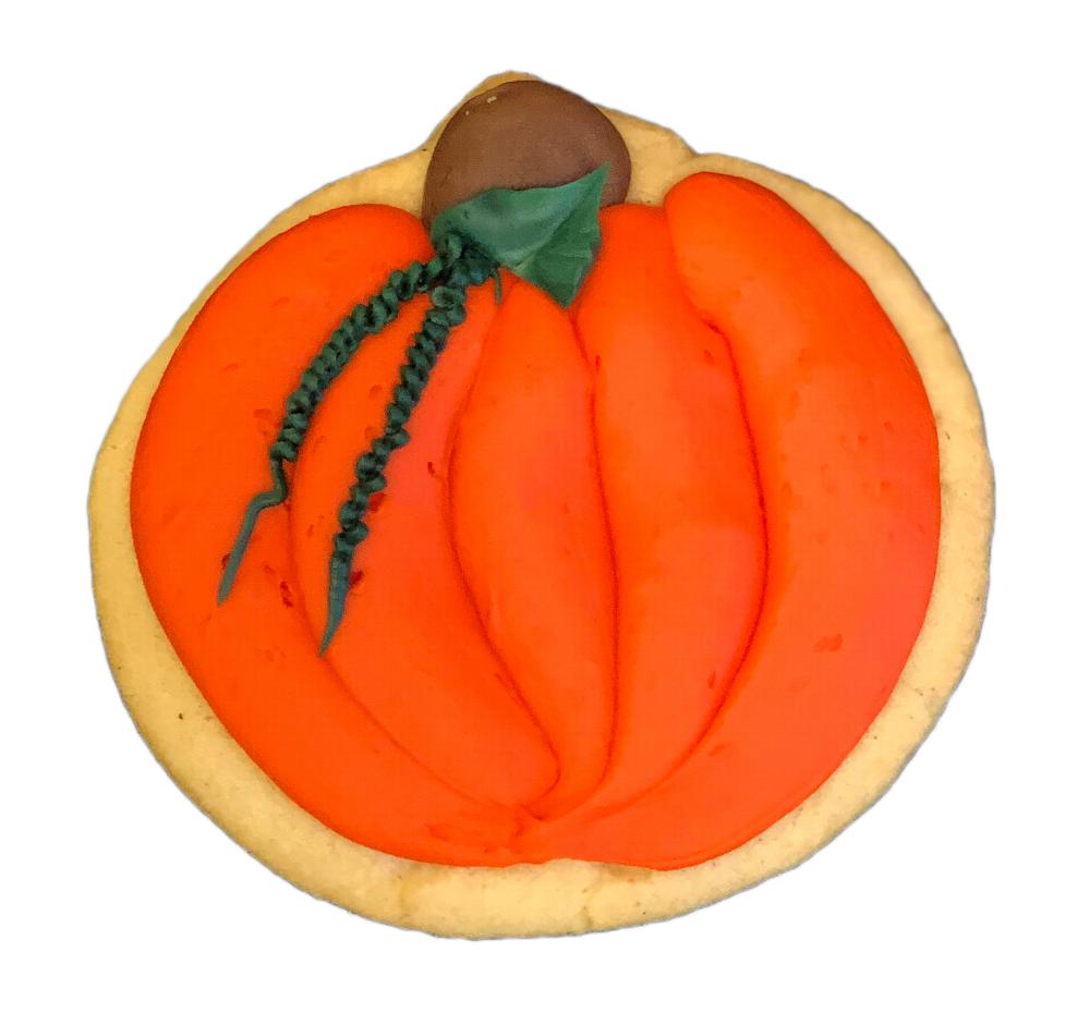 Our iced and decorated pumpkin cookie, perfect for Halloween or Thanksgiving!
